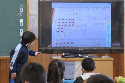 残っているのは 公開日 2022/11/30 更新日 2022/11/30 校長室から 2年算数科の研究授業です。箱に入っているチョコレートの数を、5個の列のかけ算と3個の列のかけ算の答えを足して求めました。その後、箱に残っているチョコレートの数という見方から、全部の数から食べた数を引くという方法に気づきました。この方法は便利だという感想も聞かれ、考え方を広げることができました。