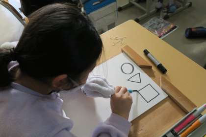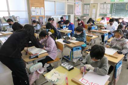 4年図画工作科の授業です。版画を製作するために、彫刻刀の安全な扱い方を時間をかけて説明します。けがをしないように両手で彫るように指導しています。子どもたちは真剣な表情で緊張感をもって練習していました。