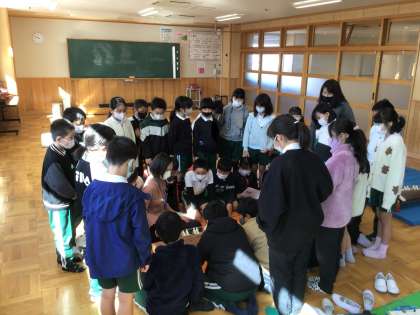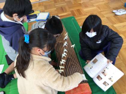 「日本の音楽でつながろう」の単元で、お琴体験をしました。いろいろな弾き方を試した後に、グループで「さくらさくら」弾きました。お琴の音色を楽しむことができました。