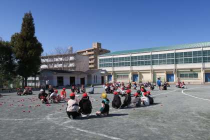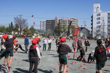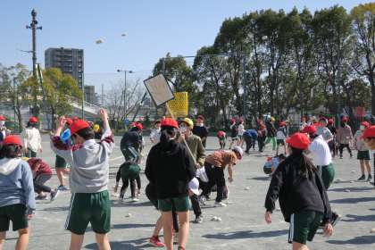 6年生が学年レクをしています。基本は玉入れですが、よく見ると先に板がついた棒で、球が入るのをじゃまする役がいます。おもしろいことを考えますね。とても楽しそうです。