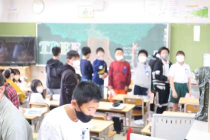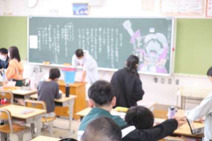 今日がこの学年で過ごす最後の日です。始業前、ボランティアで清掃活動をしている5年生に「ありがとう」と声をかけ、教室を巡ります。その5年生の教室の黒板には、担任からの最後のメッセージがかかれていました。