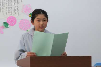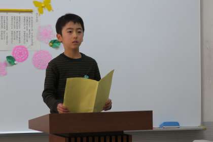 修了式をオンラインで行いました。修了認定に続いて3名の児童が作文を発表しました。学習や学級活動、行事などに精一杯に取り組んだことを、堂々と発表してくれました。