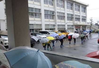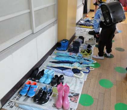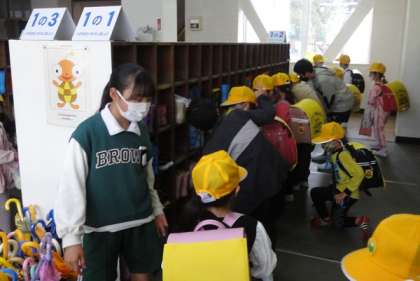 雨降りの1年生登校を心配して、6年生が登校後、昇降口に助けに来てくれました。おかげで傘立てや靴箱の位置がわかず、不安そうにしていた1年生が、安心して教室に向かうことができました。帰りは、初めての全校での一斉下校でした。通学班教室で集合し、班長さん先頭できちんと並んで、下校することができました。雨の日も安全に登下校できるよう、今後も指導していきます。