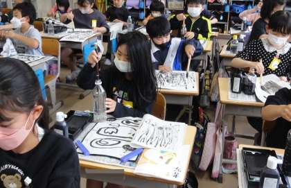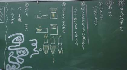 3年生では、今年から毛筆学習が始まりました。用具のならべ方や扱い方、筆の持ち方と新しいことをたくさん学習しています。今日は2回目の授業だったようです。「早く準備ができるようになったよ」とうれしそうに声をかけてくれました。