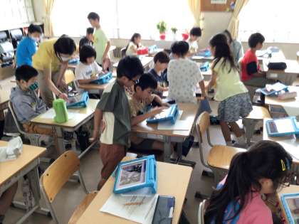 図工の学習でタブレットを活用し、自分のお気に入りの場所に小さくなった自分を入れた写真を作成しました。タブレットの画像編集アプリを使い、自分の写真をトリミングし、画像編集の仕方を学びました。