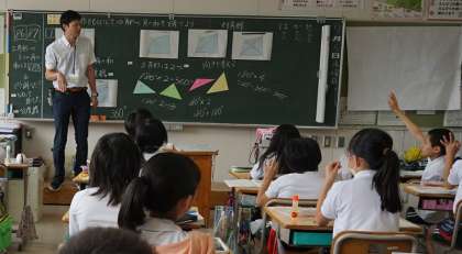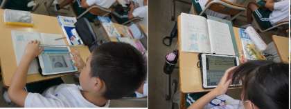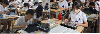 5年生算数の研究授業です。三角形の内角の和が180度であることを使って、四角形の内角の和を考えました。自分の考えを発表ノートで提出し、学習用タブレットで共有をしました。ここまでの振り返りも、発表ノートで累積しています。