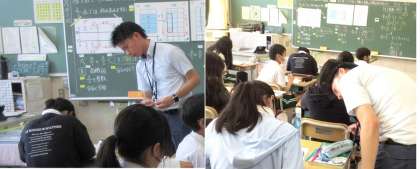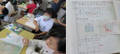 6年生算数の研究授業です。分数×分数の計算の仕方を考えました。今まで学習してきた面積の図や計算を根拠に、分母同士、分子同士をかけ算して答えを求めてよいことが説明できました。