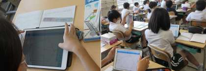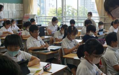 5年生算数の研究授業です。三角形、四角形と学習してきたことをもとに、五角形の内角の和の求め方を考えました。発表ノートを使って、図に書き込みながら考え、対角線をひき三角形に分けて考えると求めることができるとわかりました。その後、六角形や七角形と、多角形の内角の和についても、同様にできると考えを深めていきました。