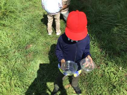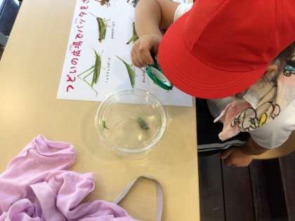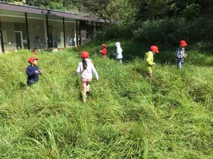 1年2組が、自然観察の森へ校外学習に出かけました。バッタ採りが得意な子も苦手な子も、容器に入れてじっくり観察しました。所員さんから教えていただいたバッタ観察の様々な視点を、来週からの授業でも使って学習を進めていきます。