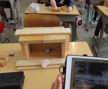 5年生図工の授業です。動きが連続して見えるアニメーションの仕組みを生かして、動きや変化を確かめながら表したいことを考えています。コマ撮りアニメーションを撮影できるアプリを使って作品を制作中です。