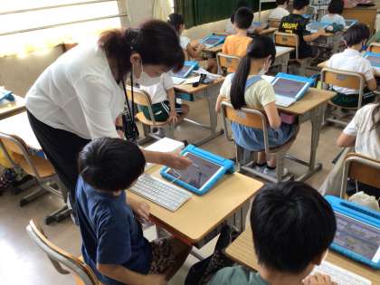 国語「ローマ字」の学習から、タブレットに付属されたキーボードを使ってタイピング練習をしました。また、ICT支援員さんにも、サポートしてもらいながら、ホームポジションを意識したタイピングを行いました。