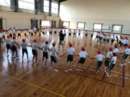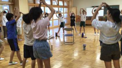 キャンプに向けて保健集会や、キャンプファイヤーのマイムマイムとスタンツの練習などをしています。子どもたちが、学級や学年で団結してキャンプを成功させようと頑張っています。