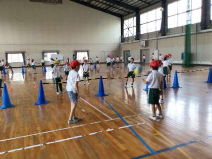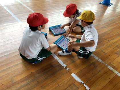 体育「プレルボール」の授業では、タブレットを作戦ボードとして活用して話し合いました。
