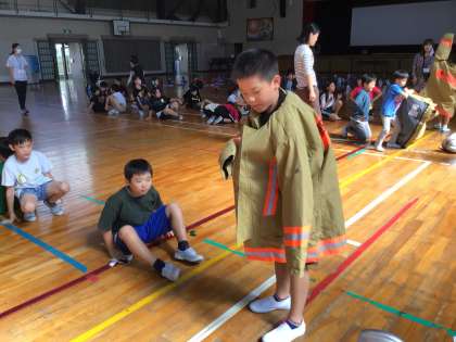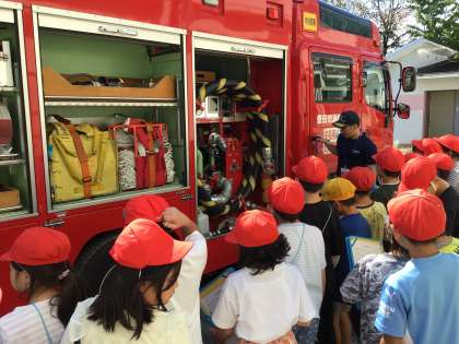 3年防火体験学習 公開日 2023/10/12 更新日 2023/10/12 各学年から 3年生社会科「火事からくらしを守る」の授業にて、豊田市消防本部予防課の方を講師としてお招きし、消防士の仕事や取組についてを学習しました。また、消防士が実際に着る防火服を着る体験をしたり、消防車の見学を行ったりもしました。