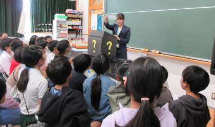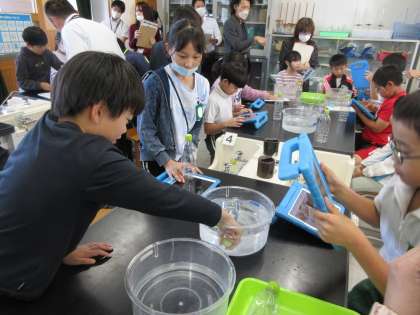 4年生理科の研究授業です。からのペットボトルに蓋をして空気を閉じ込め、氷水やお湯に入れたときに、空気の体積がどうなるのかを実験しました。今後、温度と体積に関係があるのか調べをすすめていきます。