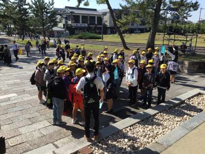 法隆寺の見学をしています。ガイドさんの解説を聞きながら、歴史と文化を感じています。