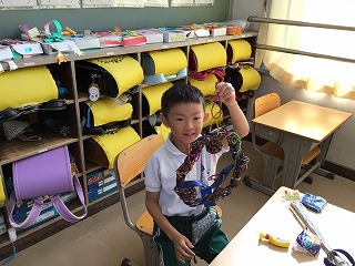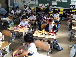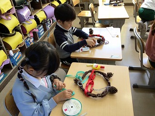 10月31日(火)、生活科でリースの飾りつけをしました。このリースは、サツマイモの収穫後、ボランティアの方々に編んでいただいたものです。さらに今回も、多くのボランティアさんに飾りつけのサポートをしていただきました。そのおかげで、子どもたちは、自分のやりたいように飾りつけをすることができました。ありがとうございました。