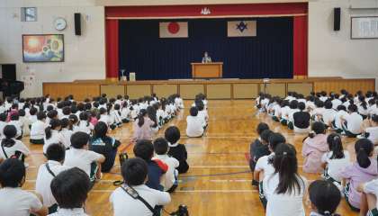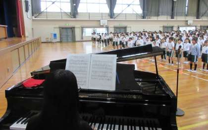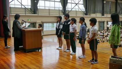 11月7日、全校集会を行いました。「あいうえお」の合言葉の「お」思いやりいっぱいの学校にみんなでしようという話をしました。その後、夏休みに応募した作文や感想文等で優秀な成績を収めた子たちの表彰式も行いました。