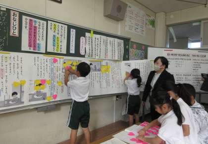 1年生国語の研究授業です。「サラダでげんき」の大好きなところを伝え合ったあと、改めて自分の好きなところを考えました。友達と意見交流を楽しみながら活動していました。