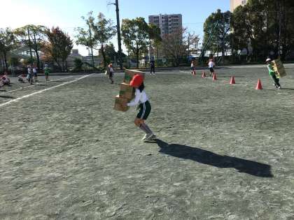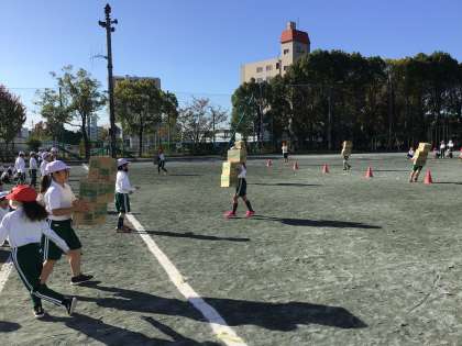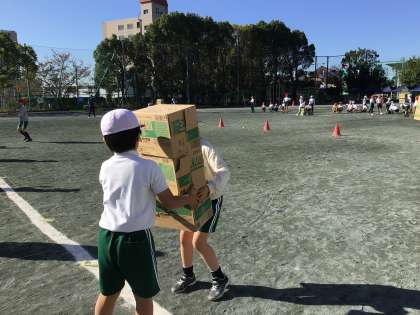 競遊 「ぐらぐらおみこしリレー」の練習です。崩れないように、バランスも考えて走っています。