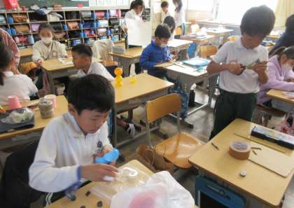 おもちゃ作り 公開日 2023/11/14 更新日 2023/11/14 校長室から 2年生、生活科「はっけんくふうおもちゃ作り」の学習です。一人一人が作りたいものを決めて、おもちゃ作りをしていました。出来上がりが楽しみです。