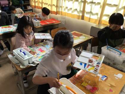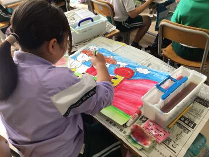 読書感想画展に向けて、丁寧に色塗りをいます。塗る順番を考えて色作りをしたり、筆を上手に使い分けたりできるようになりました。