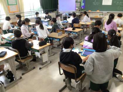 5年総合 4年生と交流しました 公開日 2023/11/16 更新日 2023/11/16 各学年から 4年生が総合の発表をタブレットのパワーポイントを活用して、3年生に発表します。 そこで昨年度SDGsを学習した5年生が先輩として、4年生にアドバイスしました。