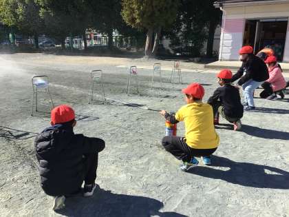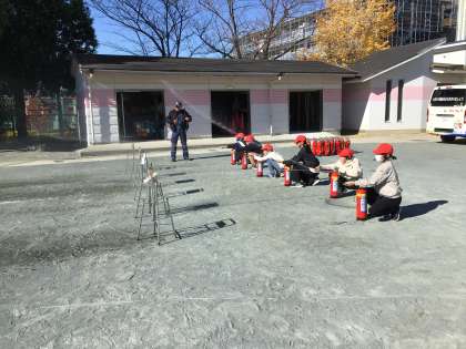 4年消火器体験(12.4) 公開日 2023/12/04 更新日 2023/12/04 各学年から 消防署の方に消火器の使い方や火災があった時の対応方法を教えていただきました。「火事だ!」と大きな声で叫んでから、的に向けて消火器の水を当てました。