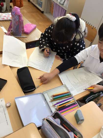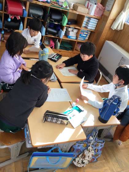 国語科「お手紙」で学んだことを生かして、1年生に音読劇を見せる予定です。「どのように読んだらがまくんやかえるくんのおもしろさやあたたかさが1年生の子達に届くかな」と試行錯誤し、話し合いながら準備を進めています。