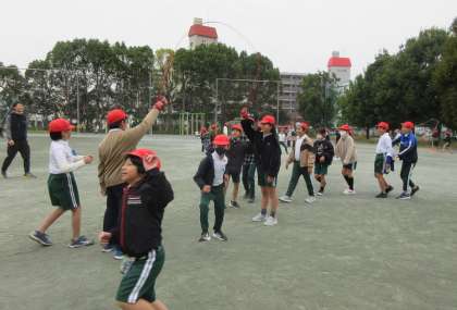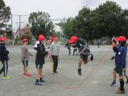 休み時間には、ドッチボールに鬼ごっこ、縄跳びと寒さに負けず、外で元気よく遊んでいる子がたくさんいます。大縄跳びに挑戦する姿も見られます。