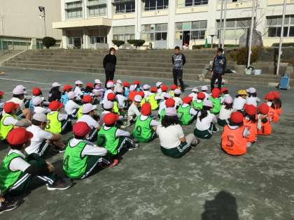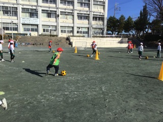 ボールを足で蹴りながら走り、コーンをまわるドリブルの練習をしています。夢中になってボールを追いかける姿が輝いて見えました。