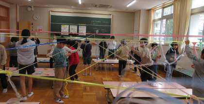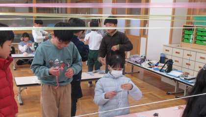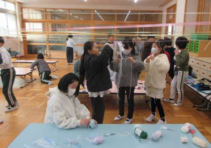 3年生図画工作科の授業です。ひもを結んだりつないだりして、楽しみながら活動していました。