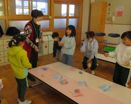 1年生の昔遊びの会に来てくださった地域の方から、手作りお手玉をプレゼントしていただきました。早速、今日の会で使わせていただきました。地域の方と昔遊びを楽しみ、楽しい時間を1年生は過ごすことができました。