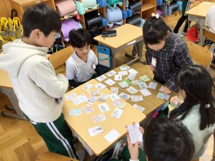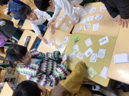 かるたに触れ、自分たちのクラスにまつわることでかるたを作り、遊びました。個性的で面白い、自分たちだけのかるたができました。