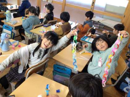 6年生を送る会の、教室の飾りつけに使う輪飾りを作りました。