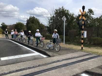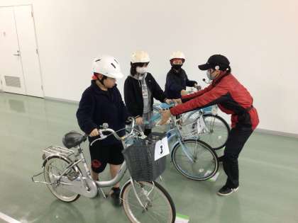 4年生で交通安全講習会を行いました。実際に自転車に乗り、交通安全のルールや、自転車の点検方法について学びました。