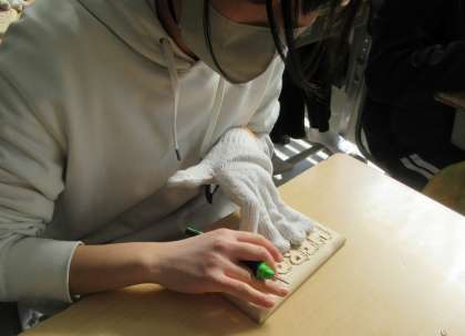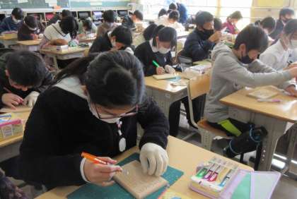 思い出の作品に 公開日 2024/02/28 更新日 2024/02/28 校長室から 6年生図画工作科の授業で、「グランドボックス」を作成しています。ふたの部分には、思い出の言葉やイラストをかき、彫刻刀で彫り進めています。思い出に残る作品になりそうです。