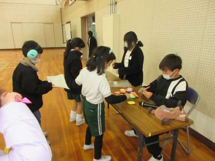 6年生が卒業プロジェクトの一つとして、全校の児童に楽しく山之手小学校のことを知ってもらもらおうと、休み時間を利用してイベントを開催しました。学校のいろいろな場所に6年生がつくったクイズのヒントが隠され、子どもたちは楽しそうに問題を解いていました。答えが分かった子どもたちが体育館に向かうと、正解者には素敵な記念品が渡されていました。