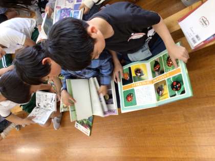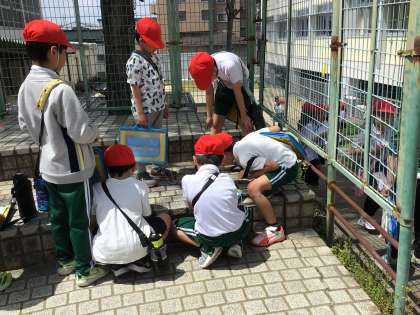 学校の中庭や校庭に動植物の観察に行きました。てんとう虫やたんぽぽなどに興味津々。