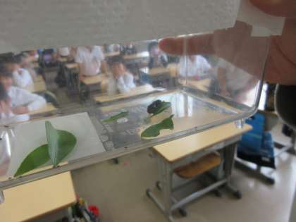 3年生理科「こん虫の育ち方」の学習です。単元の最初は、チョウのたまごや青虫、成虫の姿を比べて、気付いたことを話し合っていきます。学級では、キャベツの葉から青虫をみつけ、成長の様子を観察中です。先生が用意した黒い幼虫の観察も同時に行っていて、どんな成虫になるのか、子どもたちはとても楽しみにしているようです。