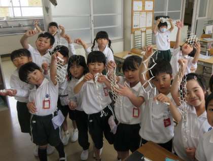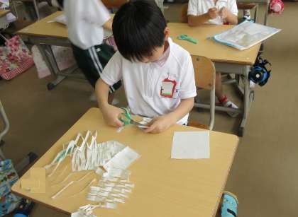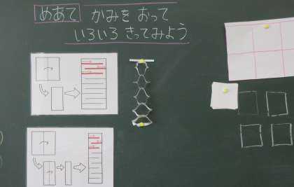 1年生図画工作科「ちょきちょきかざり」の授業です。はさみの使い方に気を付けながら、折った紙を集中して切っていました。出来上がった飾りを、子どもたちがうれしそうに見せてくれました。