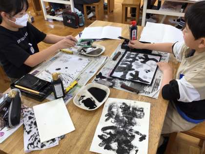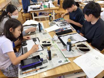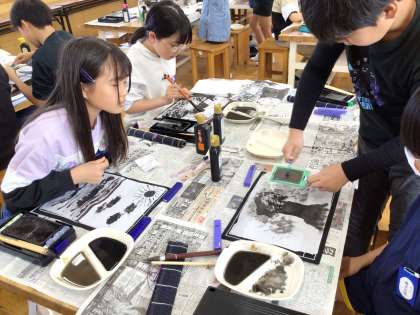 6年「墨と水から広がる世界」 公開日 2024/05/02 更新日 2024/05/07 各学年から 図工の様子です。普段は書写で使っている墨ですが、今回は図工で使用しています。かすみやにじみなどを墨で表現したり、水に墨を入れて濃さを変えたりして、楽しい雰囲気で授業に取り組んでいます。