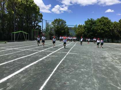 晴天の中50m走の記録を行いました。元気よく走る姿や、少しでも速くなるように全力で走っている姿が見られました。