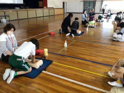 講師を招いて応急手当講習を行いました。胸骨圧迫やAEDの使い方について、実践を交えながら学ぶことができました。今日の実践を活かし、いざという時に行動できる人になってほしいと思います。