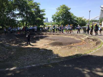 博物館で見たジオラマの場所、曽根遺跡での学習を行いました。たて穴住居の痕跡や、復元されたたて穴住居の中に入る体験をしました。