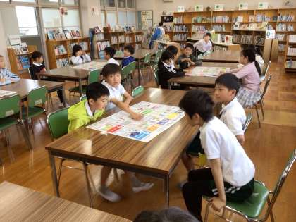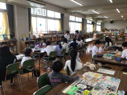 図書館司書の竹内先生に本の請求記号について詳しく教えていただきました。請求記号を使って様々な分類の本を紹介し合いました。