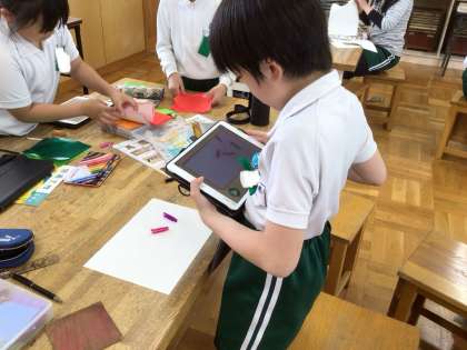 「形に命をふきこんで」の学習で、「コマ撮りアニメーション」づくりをしました。自分の考えやイメージを表現するために、コマ撮りを頑張っていました。完成した作品は、ショートムービーになり、最後にグループで鑑賞会をしました。