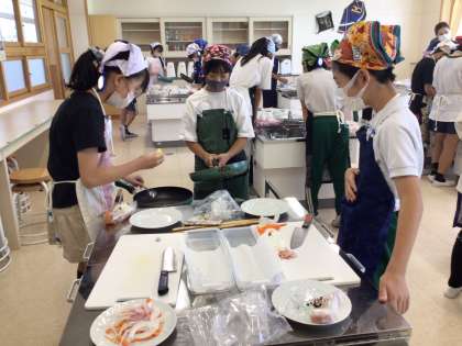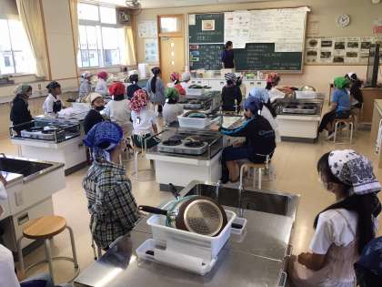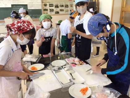 6年調理実習 公開日 2024/05/29 更新日 2024/05/29 各学年から 家庭科の授業でいろどりいためを作りました。5年生では使わなかった油を使った料理になります。美味しくできたようで、笑顔が溢れていました。 フライパンに残った油はペーパーで拭き取り、環境にも気をつけて片付けまで協力して行いました。