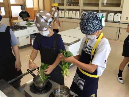 家庭科の調理実習で「ほうれん草のおひたし」を作りました。お茶を沸かす学習はしましたが、包丁やまな板、さいばし、ボウルなど調理器具を本格的に使ったのは初めてです。調理の手順に気を付けて取り組んでいました。