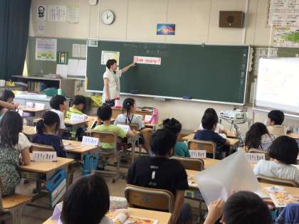 外国語活動の授業の様子です。英語での数の数え方を勉強しています。子どもたちは、1〜20までの数を英語で言えるようになりました。発音の仕方をよく聞いて、真似しています。